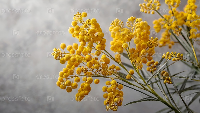 Красивый пушистый букет мимозы на сером фоне. Близко. Идея весны и Международный женский день 8 марта
