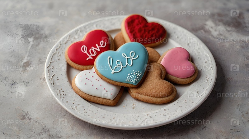 Домашнее имбирное печенье в форме сердца в красном сахаре. Вкусное имбирное печенье сердце на сером бетонном фоне. Свежеиспеченные пряники на День святого Валентина