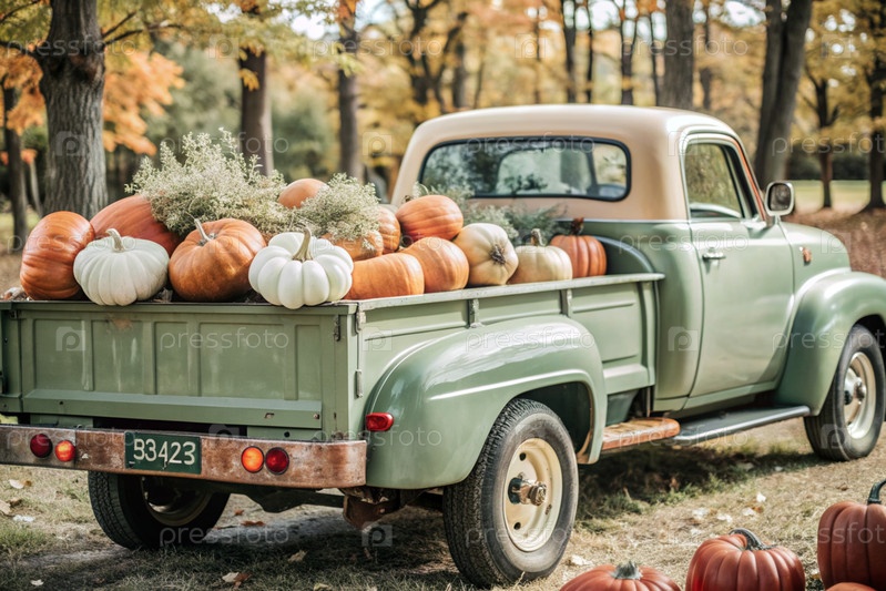 Осень, осенний дизайн. Большой урожай тыкв на заднем сиденье ретро-пикапа, крупным планом