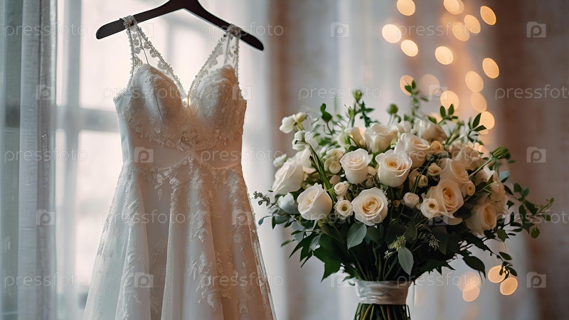 Близко. Элегантное белое свадебное платье на вешалке и букет цветов. Утро невесты. Аренда и покупка свадебных платьев для проведения мероприятий
