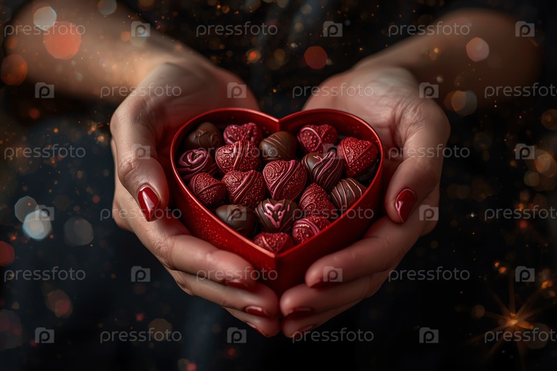 Концепция Дня святого Валентина. Руки женщины с подарком в форме сердца с шоколадными конфетами на День святого Валентина