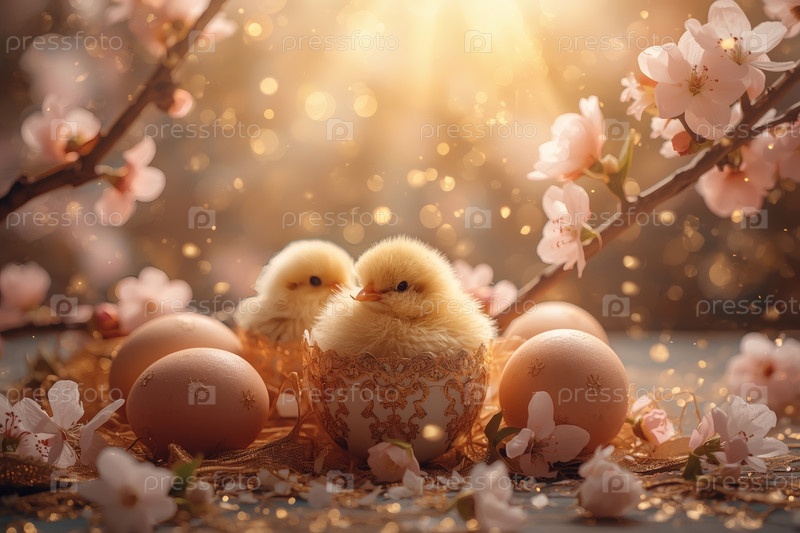 Концепция яркого пасхального праздника. Нежные розовые пасхальные яйца, желтые куры и ветви сакуры на деревянном фоне. Концепция яркого пасхального праздника в 2026 году
