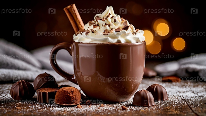 Кружка горячего какао или кофе со сливками и шоколадом. Уютное фото в мягких, теплых коричневых тонах. Понятие вкуса, гармонии и комфорта