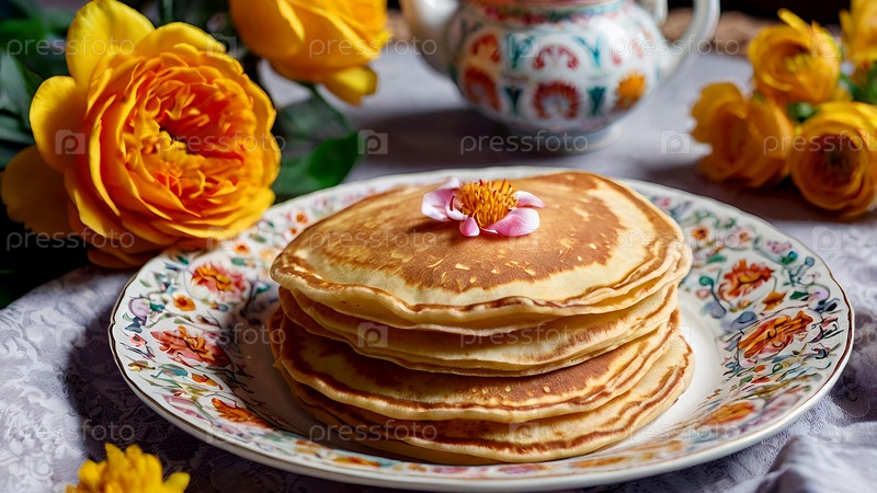 Российский праздник Масленица. Традиционные русские блинчики выложены на декоративной плите на фоне яркой керамики и весенних цветов