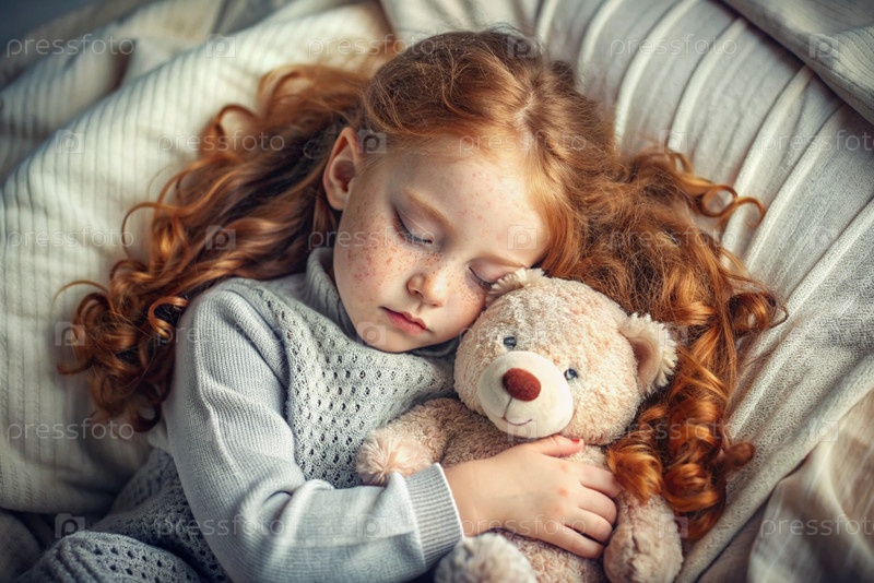Маленькая девочка с рыжими вьющимися длинными волосами и веснушками спит в своей постели, обнимая плюшевого медведя