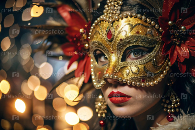 Венецианский карнавал. Закрытие женщины в богато украшенной карнавальной маске. Яркие цвета передают атмосферу праздника и роскоши