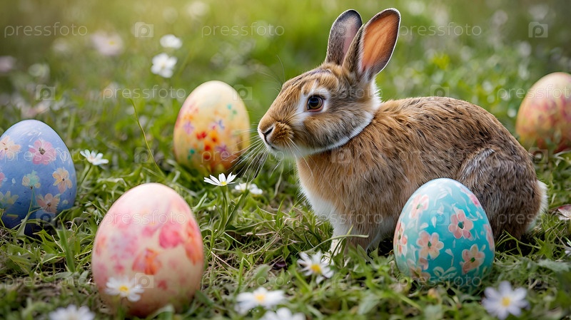 Концепция яркого пасхального праздника. Нежные пасхальные яйца и пасхальный кролик