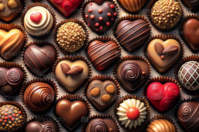Ассортимент изысканного шоколада, белого, темного и молочного шоколада. Предыстория сладостей. Концепция Дня святого Валентина