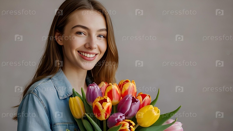 Знамя. Девушка держит красивый букет тюльпанов. Поздравительная открытка на 8 марта и Международный женский день. Концепция поздравлений и торжеств