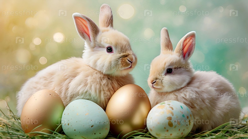 Концепция яркого пасхального праздника. Нежные пасхальные яйца, кролики на пастельном фоне