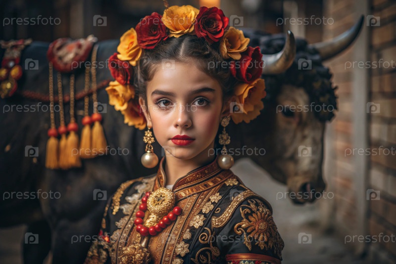 Испанская девушка в традиционном испанском национальном костюме. На фоне быка. Бой быков. Портрет символизирует традиции и культуру народа Испании
