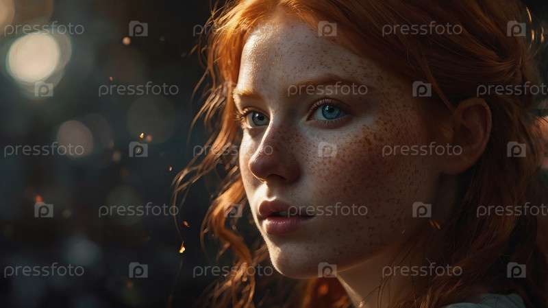 Портрет красивой рыжеволосой девушки с вьющимися волосами и веснушками на лице при солнечном свете