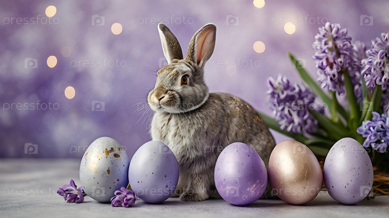 Концепция яркого пасхального праздника. Нежные пасхальные яйца, серый кролик и фиолетовые цветы гиацинта на пастельном акварельном фоне с нежными венами