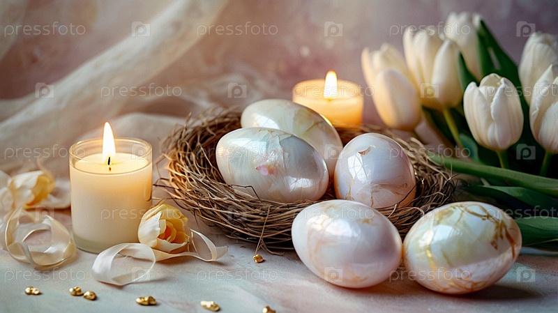 Концепция яркого пасхального праздника. Нежные пасхальные яйца в жемчужной корзине и нежные цветы на пастельно-водяном фоне