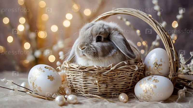 Концепция яркого пасхального праздника. Нежные пасхальные перламутровые яйца в корзине, кролик и нежные цветы на пастельном акварельном фоне