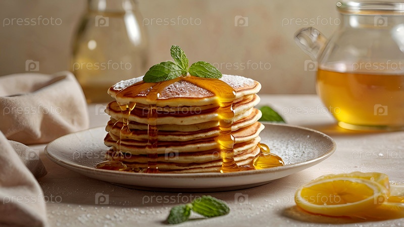Вкусные блинчики с медом и листьями мяты на стильной тарелке в бежевой кухне. Концепция русского праздника Масленица