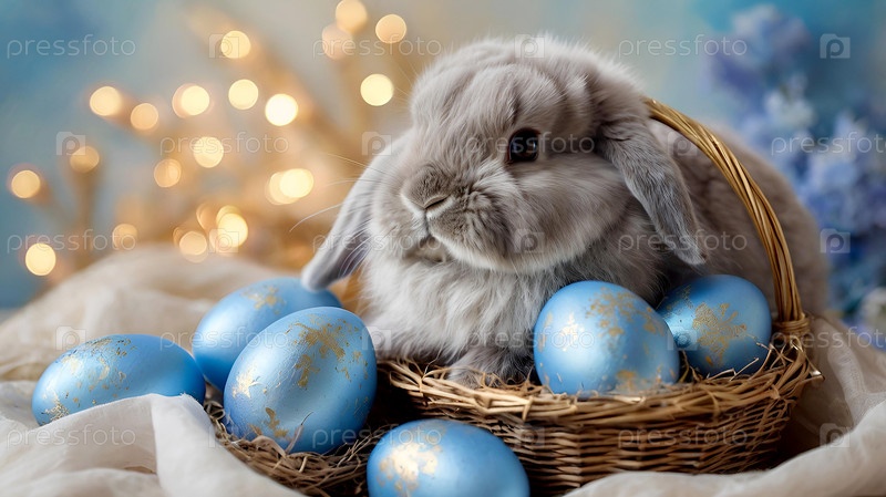 Концепция яркого пасхального праздника. Нежные пасхальные яйца, серый кролик и голубые цветы гортензии на пастельном акварельном фоне с нежными венами