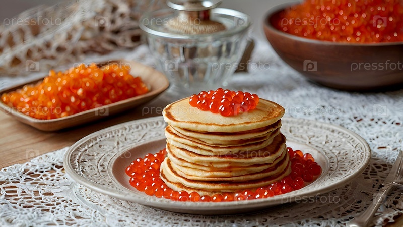 Русские традиции. Российский праздник Масленица. Натюрморт со стопкой блинов и красной икрой