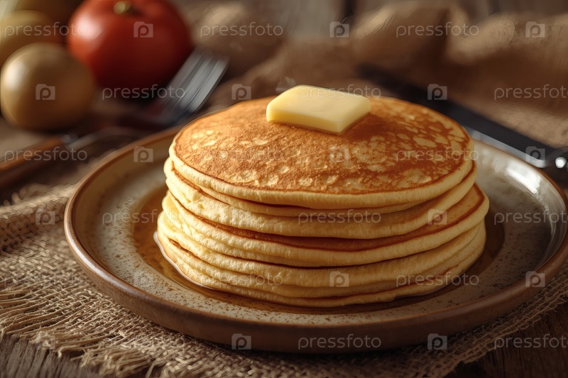 Вкусные горячие блинчики или оладьи с маслом. Концепция русского праздника Масленицы