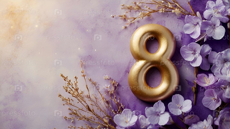 Международный женский день. Праздник приходится на 8 марта. Баннер, флаер. Праздничный, нежный фиолетовый цветочный фон с номером 8
