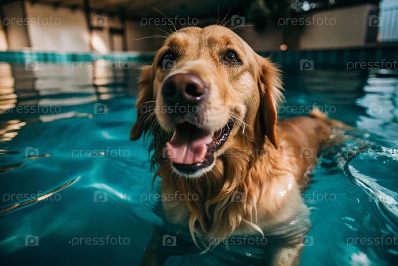 Близко. Счастливый золотой ретривер в розовых очках на розовом надувном кольце плавает в бассейне. Концепция дружественных отпусков для домашних животных
