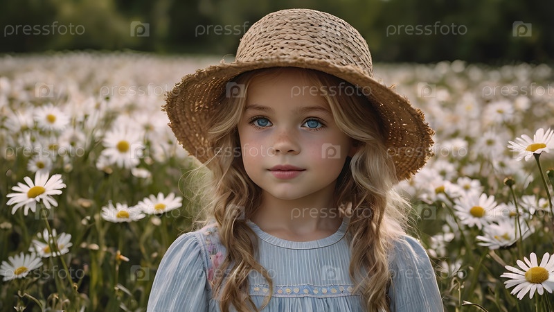 Всероссийский день семьи, любви, верности. Красивая маленькая кудрявая девочка в соломенной шляпе на фоне поля ромашек. День Святого Валентина Петра и Февронии