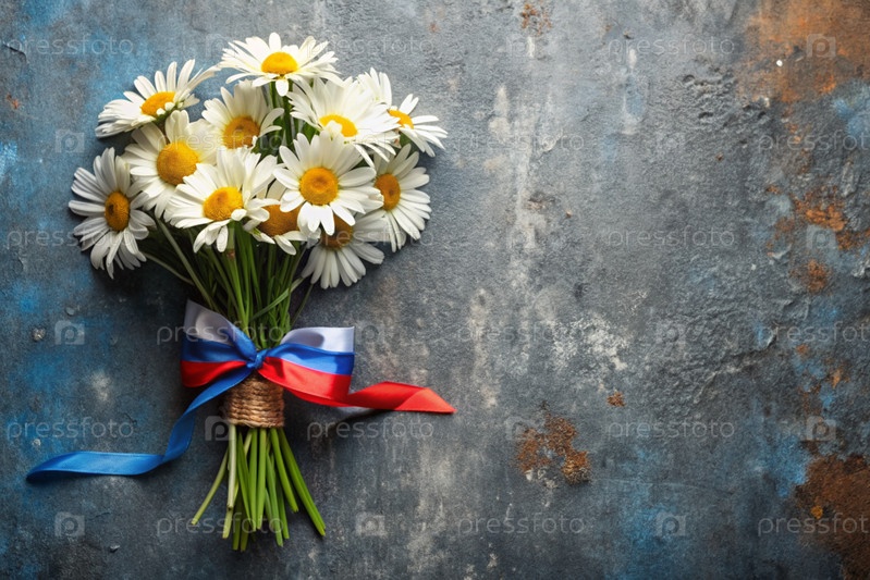 Всероссийский день семьи, любви, верности. Дейзи, букет ромашек и ленточный триколор России. День Святого Валентина Петра и Февронии