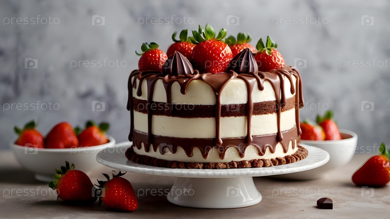 Концепция праздничных блюд. Пекарня. Красивый вкусный торт со свежей клубникой и шоколадом на столе. День рождения и сладости