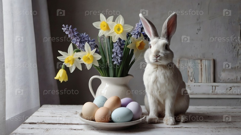 Концепция яркого пасхального праздника. Ретро интерьер дома с пасхальным декором. Весенние цветы в белой вазе, кролик и пасхальные яйца в пастельных оттенках
