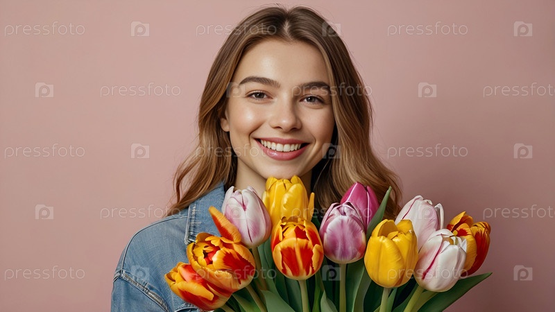 Знамя. Девушка держит красивый букет тюльпанов. Поздравительная открытка на 8 марта и Международный женский день. Концепция поздравлений и торжеств