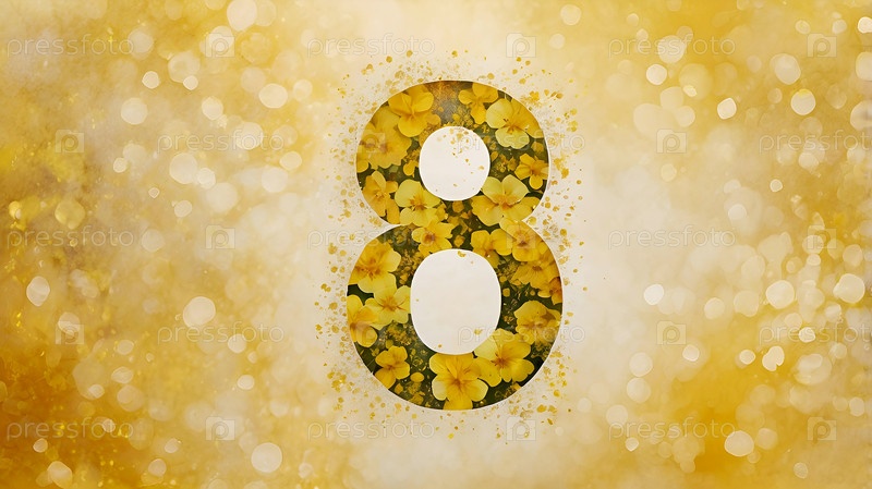 Международный женский день. Праздник приходится на 8 марта. Баннер, флаер. Праздничный желтый цветочный фон с номером 8