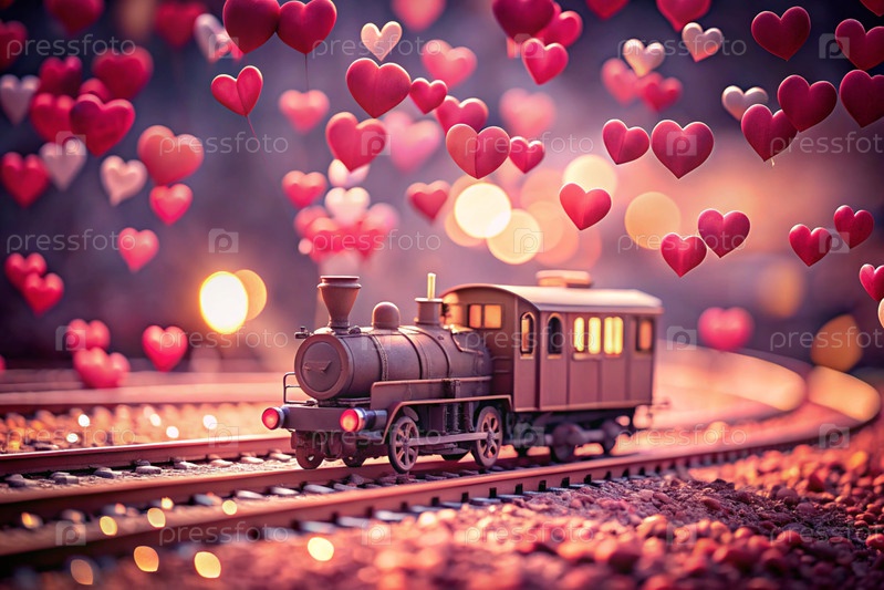 Любовное путешествие. Поезд и сердца вокруг. Подарок для любимой в День святого Валентина как романтическое путешествие. Баннер для предложений и акций от туроператора