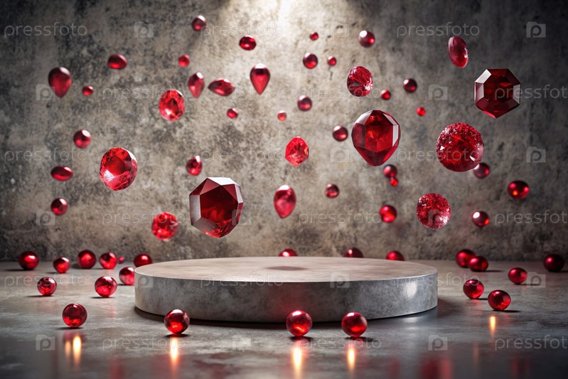Минималистический фон для демонстрации ювелирных изделий. Современный пустой подиум с серой стеной и рубинами. Креативный дизайн для презентации продукта