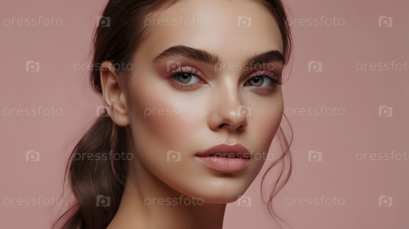Красивый портрет естественной девушки на нейтрально-розовом фоне. Косметология, уход за кожей, уход за лицом и макияж