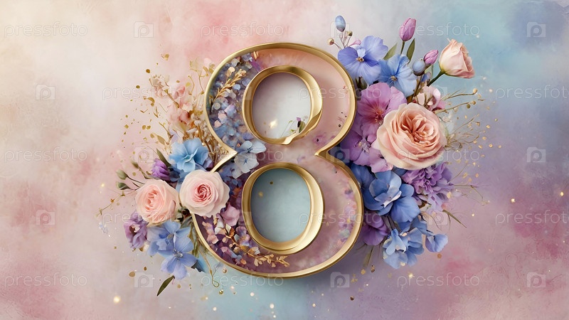 Международный женский день. Праздник приходится на 8 марта. Баннер, флаер. Праздничный цветочный фон с номером 8
