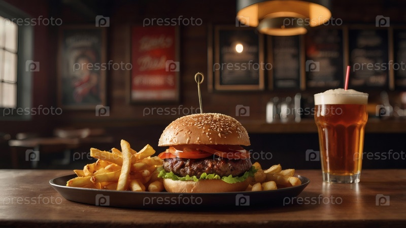 Завершение сочного говяжьего гамбургера, картошки фри и стакана пива. Концепция быстрого питания и быстрого питания