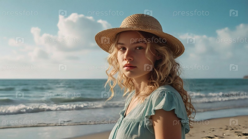 Женщина на отдыхе, сидящая в купальнике и широкополой соломенной шляпе на пляже в солнечный день и глядящая на море