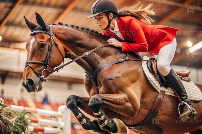 Крупный план олимпийской лошади и всадника, перепрыгивающего через препятствие на открытой арене, конный спорт. Концепция летних Олимпийских игр