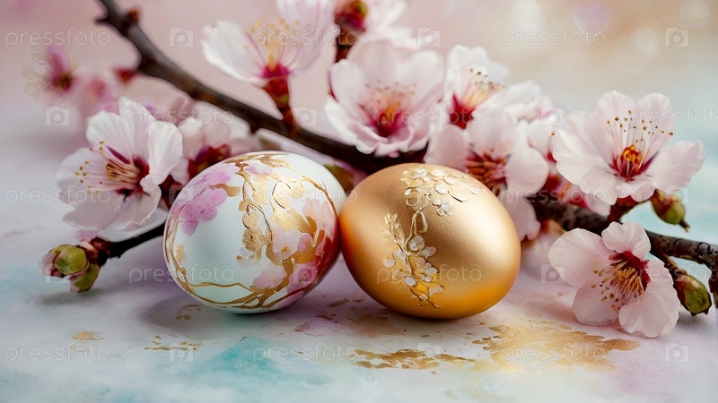 Концепция яркого пасхального праздника. Нежные пасхальные яйца и вишневые ветви цветут на пастельном акварельном фоне с нежными прожилками