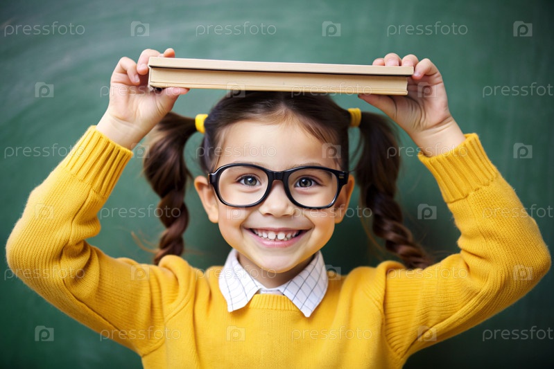 Красивая девушка с очками и книгами на голове. Ребенок впервые ходит в школу. Ребенок в классе на фоне доски. Вернемся в школу