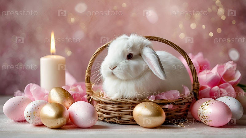 Концепция яркого пасхального праздника. Нежные пасхальные яйца, кролик и нежные цветы на пастельном акварельном фоне с нежными венами