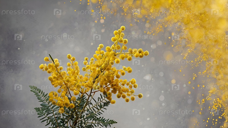 Красивый пушистый букет мимозы на сером фоне. Близко. Идея весны и Международный женский день 8 марта