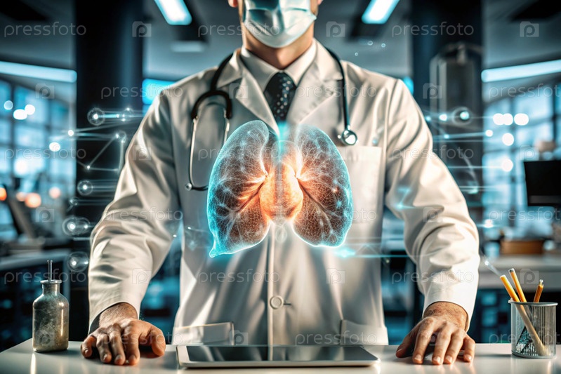 Врач в белом халате демонстрирует голографическую модель легкого человека. Развитие медицинских технологий с использованием искусственного интеллекта