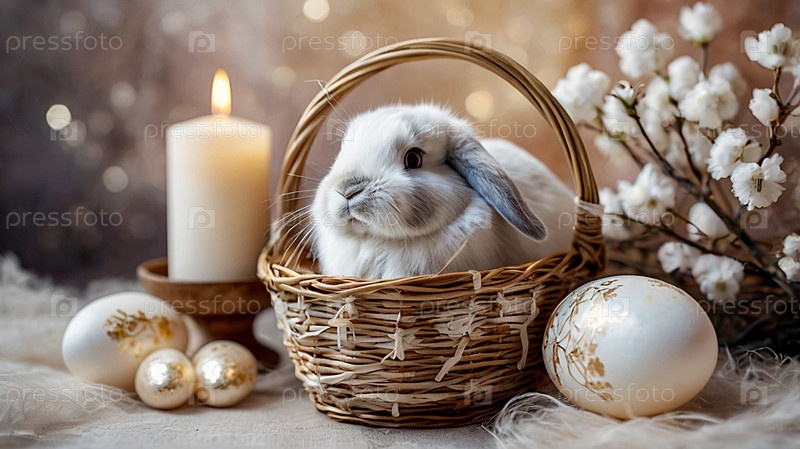 Концепция яркого пасхального праздника. Нежные пасхальные перламутровые яйца в корзине, кролик и нежные цветы на пастельном акварельном фоне