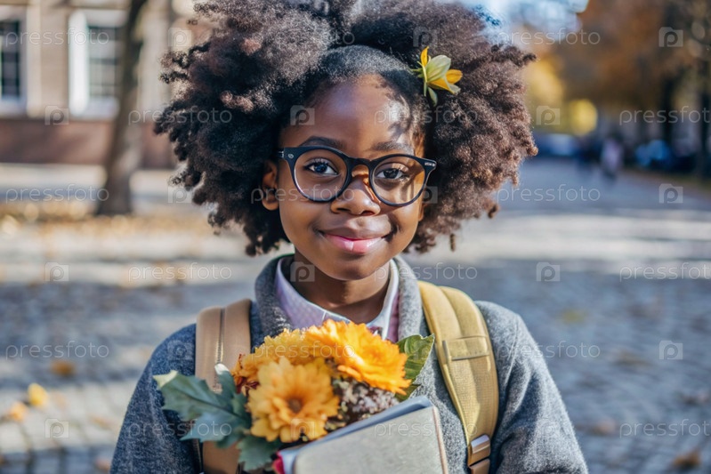 Симпатичная афроамериканка в очках с букетом осенних цветов впервые идет в школу. Ребенок со школьной сумкой, книгой и цветами. Ребенок на городской улице. Вернемся в школу