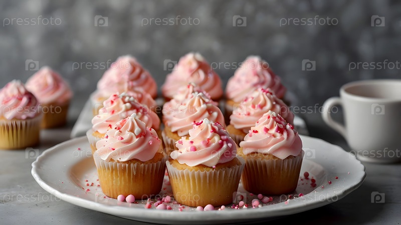Праздничные кексы, запеченные выпечкой на розовом фоне с блестками, идеально подходят для романтических торжеств. День святого Валентина, свадьба