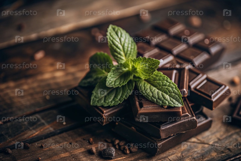 Свитс. Куски шоколада со свежими листьями мяты на десерт на деревянном фоне