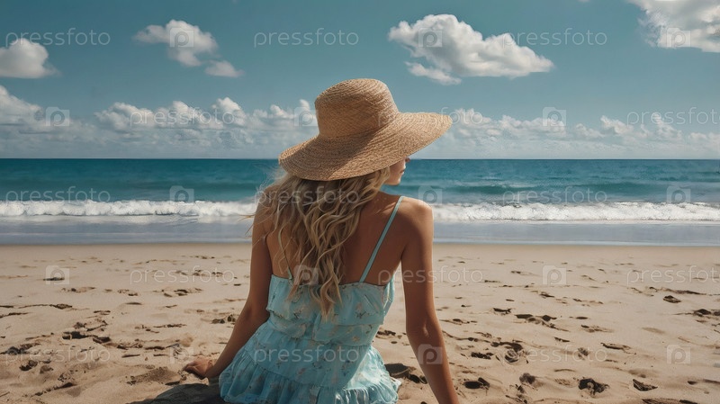 Женщина на отдыхе, сидящая в купальнике и широкополой соломенной шляпе на пляже в солнечный день и глядящая на море