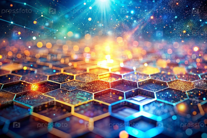 Высокотехнологичный материал. Крупный план сотового рисунка с разноцветными огнями, создающий абстрактный и футуристический дизайн. Концепция развития и технологии будущего