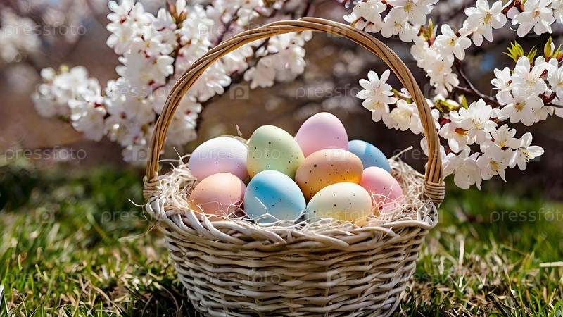 Концепция яркого пасхального праздника. Красивый фон с пасхальными яйцами в плетеной корзине и весенними цветами вишни